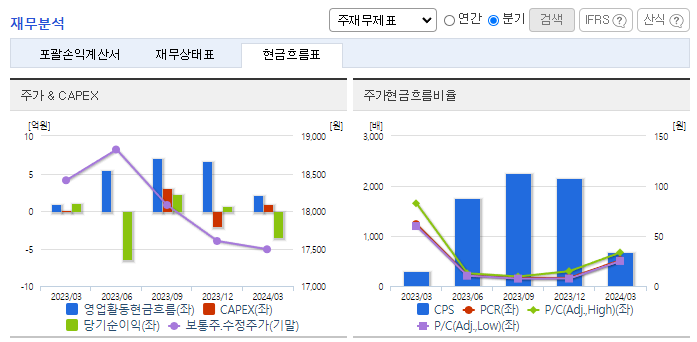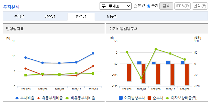 -2024년 3월 전년동기 대비 연결기준 매출액은 19.1% 감소, 영업이익 적자전환, 당기순이익 적자전환. 전기자동차 시대가 도래하며 동사의 매출의 94%를 차지하고 있는 유류판매가 저조함에 따라 매출 감소 및 적자전환됨. 대체에너지 및 녹색성장에 대한 국가적 관심이 고조되고 있는 가운데 점차적인 유류판매에 대한 수요 감소가 예상됨에 따라 새로운 사업 확장이 필요한 상황임.