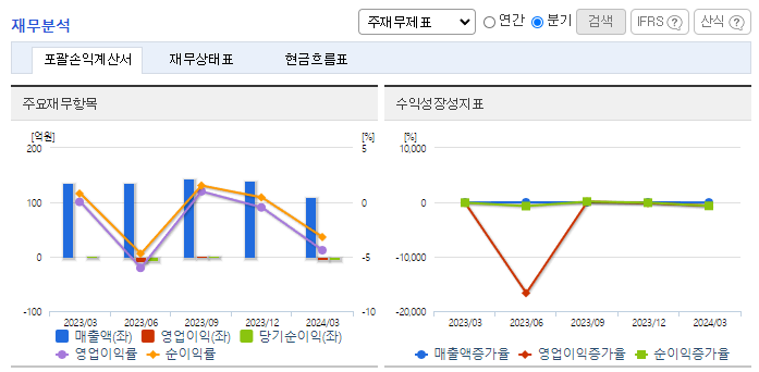 -2024년 3월 전년동기 대비 연결기준 매출액은 19.1% 감소, 영업이익 적자전환, 당기순이익 적자전환. 전기자동차 시대가 도래하며 동사의 매출의 94%를 차지하고 있는 유류판매가 저조함에 따라 매출 감소 및 적자전환됨. 대체에너지 및 녹색성장에 대한 국가적 관심이 고조되고 있는 가운데 점차적인 유류판매에 대한 수요 감소가 예상됨에 따라 새로운 사업 확장이 필요한 상황임.