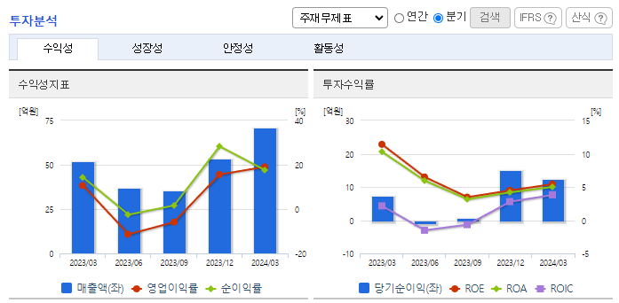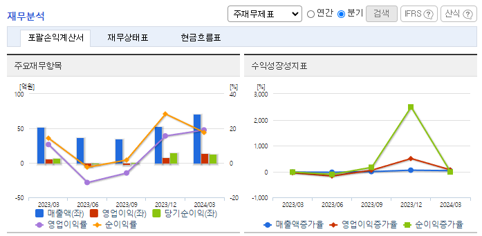 -2024년 3월 전년동기 대비 별도기준 매출액은 36.3% 증가, 영업이익은 144.5% 증가, 당기순이익은 67.8% 증가. 반도체 업황 및 수요 회복에 따른 제품판매 증가로 매출 회복 중으로, 국내거래처 외 중국, 대만 등 해외 매출액 증가하고 있음. 글로벌 시장 진출을 위하여 일본, 대만, 중국의 에이전트와 함께 해외고객을 대상으로 한 영업활동을 통해 수출이 급격히 증가하고 있고, 주요 매출처 다변화되어 있음.