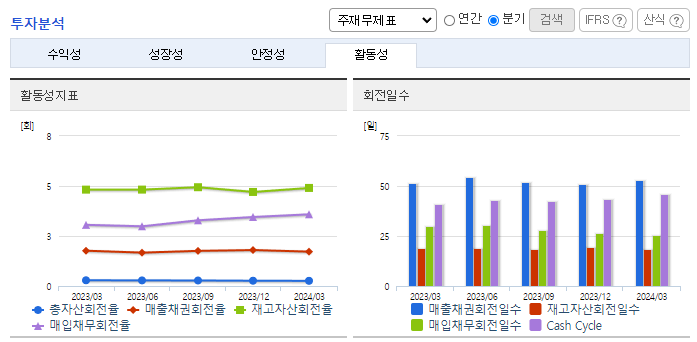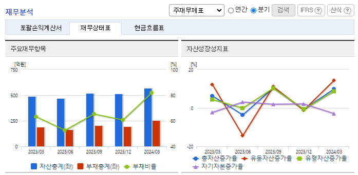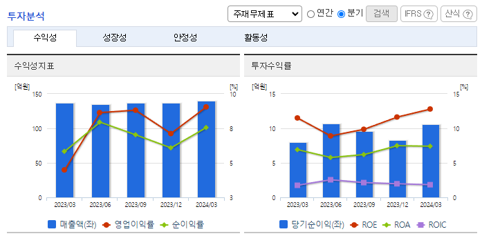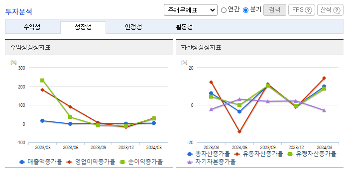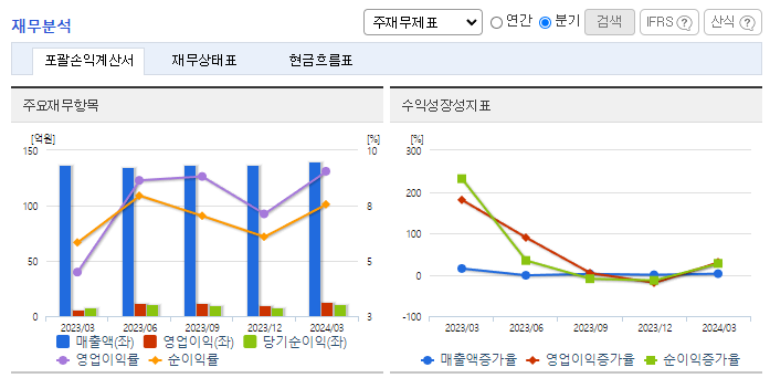 -2024년 3월 전년동기 대비 연결기준 매출액은 2.3% 증가, 영업이익은 106.2% 증가, 당기순이익은 32.7% 증가. 폴리우레탄(PU) 폼 업종의 매출액 증가하고 마진제품판매에 중점을 두어 타사에 비해 제조원가를 낮추는데 노력하여 매출원가 절감을 실현하여 영업이익이 증가함. 완제품이 아닌 중간소재를 판매하지만 고수익 부가가치가 높은 고밀도 제품 및 고기능성 제품을 차별화에 노력.