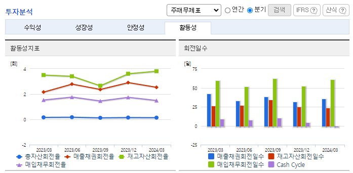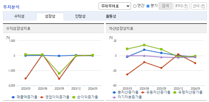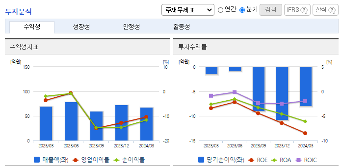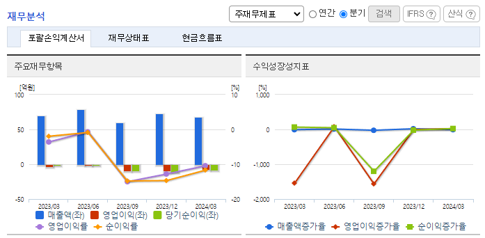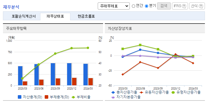 -2024년 3월 전년동기 대비 별도기준 매출액은 3.3% 감소, 영업손실은 180.2% 증가, 당기순손실은 478.8% 증가. 최근 동물보호단체 등에서 동물가죽에 대한 사용 거부감 등으로 자동차 소재 부분에서도 비건인조피혁의 수요가 점진적으로 증가할 것으로 예상됨. 바이오소재를 적용한 제품개발로 차별화된 PVC 인조피혁이 가능하게 됨으로써 환경친화적인 이미지까지 추가하여 BAG용 등 영역의 확대가 기대됨.