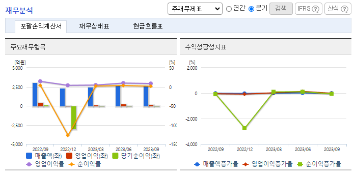 -2023년 9월 전년동기 대비 연결기준 매출액은 13.9% 감소, 영업이익은 63.8% 감소, 당기순이익은 86.1% 감소. PC게임(카카오 배틀그라운드, 아키에이지 외), 모바일게임, 골프, 무선통신기기(스마트 헬멧 등) 사업부문에서 전체적으로 매출이 전년동기 대비 감소하였음. 2023년 상반기부터 '폴리곤'을 시작으로 글로벌 유수의 체인들과의 크로스체인 환경 구축을 통해 'BORA'의 접근성과 글로벌 인지도 제고에 노력.