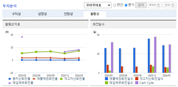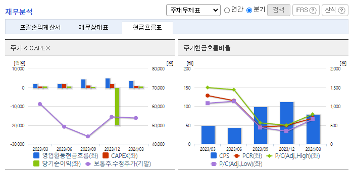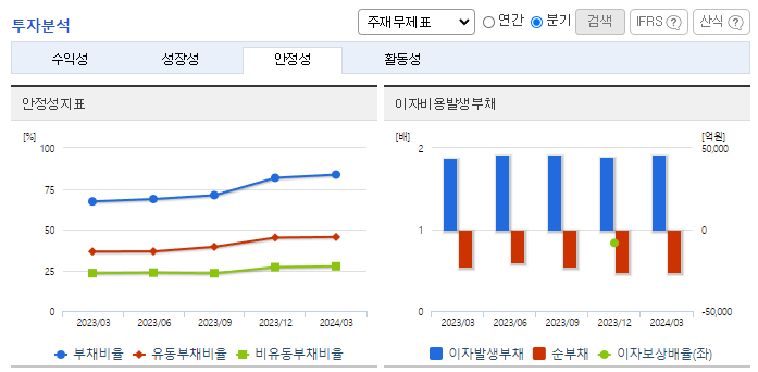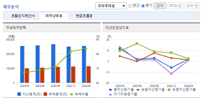 -2024년 3월 전년동기 대비 연결기준 매출액은 22.5% 증가, 영업이익은 92.2% 증가, 당기순이익은 232.1% 증가. 자회사인 카카오모빌리티와 카카오페이의 매출이 가파르게 증가한 것이 영업이익 증가에 긍정적인 영향을 미쳤고, 중국 이커머스 플랫폼이 한국에 본격 진출하면서 광고사업이 호황을 띤 것도 호재로 작용하였음. 톡비즈는 동사 전체 매출에서 차지하는 비중이 상당히 큰데, 최근 성장세가 둔화되고 있음.