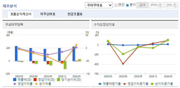 -2023년 12월 전년동기 대비 연결기준 매출액은 6.6% 감소, 영업손실은 81.7% 증가, 당기순손실은 6.3% 감소. 매출이 전년 대비 줄었고, 판매비와 관리비는 지난해와 비슷한 수준을 유지했음. 이에 수익성은 전년 대비 큰 폭으로 악화됨. '바비톡'은 리뉴얼 이후 추가된 투표기능 등을 소개하는 마케팅 콘텐츠를 제작하여 SNS 채널에 집중 홍보하며 인플루언서들을 이용한 마케팅 활동을 전개 중임.