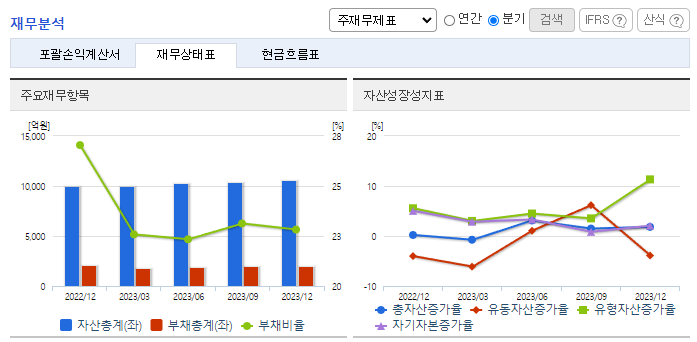 -2023년 12월 전년동기 대비 연결기준 매출액은 15.3% 감소, 영업이익은 34.4% 감소, 당기순이익은 52.2% 감소. 공사매출 부문은 전년도 대비 반도체 투자 감소에 의한 수주 감소 영향으로 매출/이익이 감소했음. 동사의 다른 핵심 사업인 소재 및 부품 부문의 매출은 전년도 대비 36.2% 증가한 1,554억 원, 순이익은 전년도 대비 64.5% 증가한 205억 원을 기록하여 전년도 대비 증가된 실적을 기록했음.