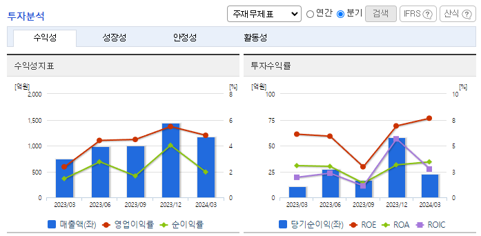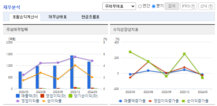 -2024년 3월 전년동기 대비 연결기준 매출액은 56.5% 증가, 영업이익은 217.9% 증가, 당기순이익은 118.3% 증가. 클린룸산업 부문(산업용 클린룸, 드라이룸, 바이오클린룸)의 매출호조로 수익성이 대폭 증가함. 24년부터 본격적으로 물류센터 신규 설립 관련 프로젝트를 진행할 계획이며, 관련 사업을 통해 발생한 매출은 아직 없으나, 향후 사업영역 확대에 대비하고 있음.