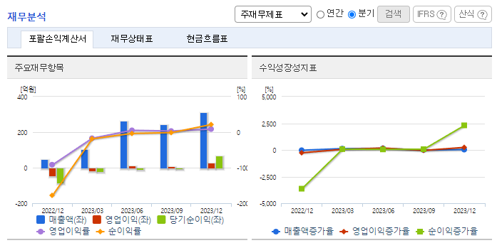 -2023년 12월 전년동기 대비 연결기준 매출액은 530.3% 증가, 영업이익 흑자전환, 당기순이익 흑자전환. 매출원가가 크게 늘었지만 매출이 이를 상회하는 수준으로 늘었고, 판매비와 관리비는 효율적으로 집행해 영업이익 흑자전환에 성공했음. 2023년 2월 폐배터리 재활용을 주된 사업으로 하는 세기리텍을 인수(지분 100%)하여, 2023년 3월 매출부터 반영되고 있음.