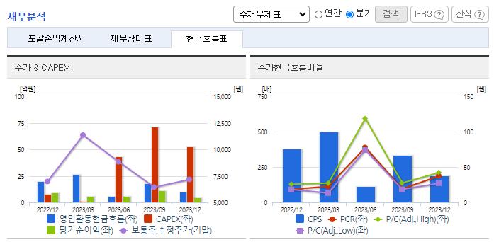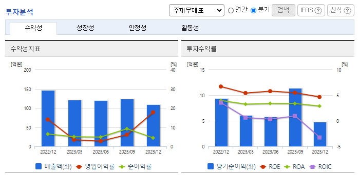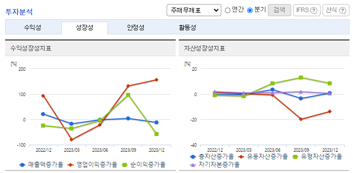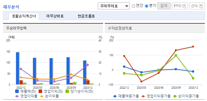 -2023년 9월 전년동기 대비 별도기준 매출액은 13.6% 감소, 영업이익은 37.1% 감소, 당기순이익은 19% 감소. 매출액 감소와 함께 매출원가도 -13.5%를 기록하며 함께 감소했지만, 판관비는 오히려 3.6% 증가하면서 영업이익이 감소함. 매출부문 중 의약소재를 제외하곤 모두 증가했지만, 의약소재 사업부문이 77.32% 감소하며 전체 외형 성장에 악영향을 줌.