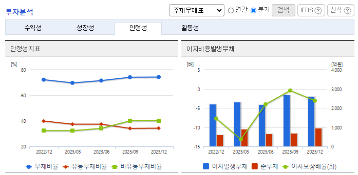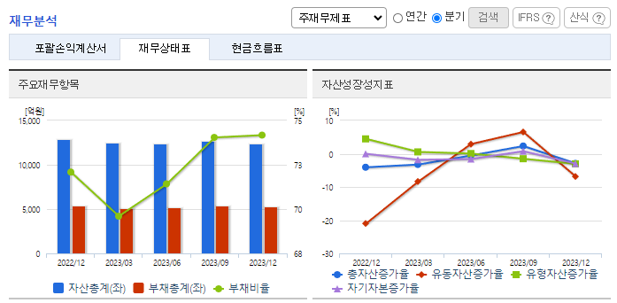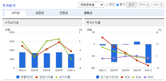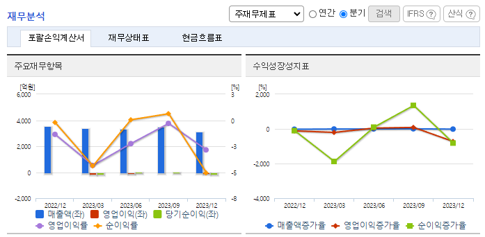 -2023년 12월 전년동기 대비 연결기준 매출액은 16.6% 감소, 영업이익 적자전환, 당기순이익 적자전환. 동사의 전체 매출액은 전방시장 침체로 전년대비 감소했고, 영업손익은 신규투자에 따른 고정비 부담 등으로 적자전환 했음. 동사는 2024년 하반기로 예상 중인 전방시장의 본격적인 실적 회복과 함께 이익 극대화를 실현할 수 있도록 전사적 노력을 기울이고 있음.