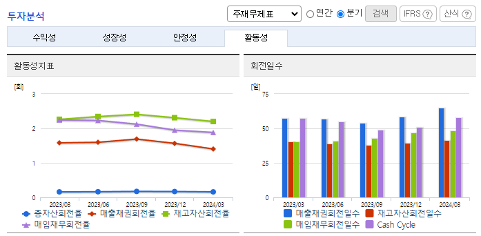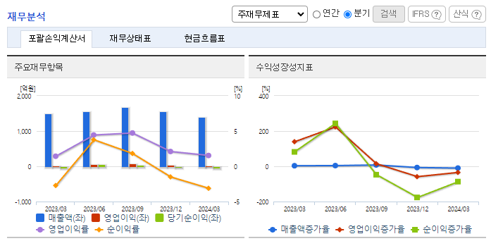 -2024년 3월 전년동기 대비 연결기준 매출액은 6.2% 감소, 영업이익은 0.6% 증가, 당기순이익 흑자전환. 국내 건강기능식품 시장 포화와 경쟁 심화로 인해 매출 하락했으나 호주법인의 글로벌 고객사 신규 유입에 따른 성장으로 일정 부분 상쇄하였음. 영업이익은 건기식 부문 매출 하락으로 고정비 부담이 증가했지만 지주 부문 상쇄효과로 전년동기 수준을 유지하게 되었음.