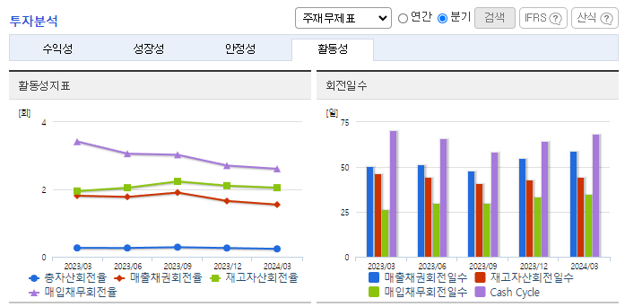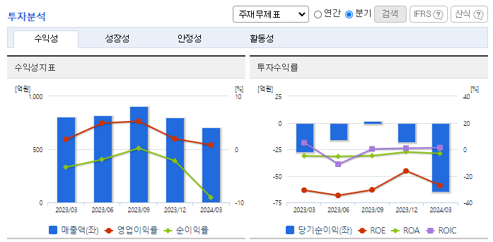 -2024년 3월 전년동기 대비 연결기준 매출액은 11.7% 감소, 영업이익은 61.4% 감소, 당기순손실은 124.4% 증가. 매출 중 69%를 해외에서 실현할 정도로 수출의존도가 높은 상황이나 세계정세 및 금리 불안정이 악영향을 미쳐 매출이 감소하였음. 탄탄한 레퍼런스를 바탕으로 시장을 확대해 나가고 있으며 특히 코로나 19 이후 중국에서는 건강기능식품에 대한 수요 증가와 온라인 직구 채널이 활성화되어 성장기회를 노리고 있음.