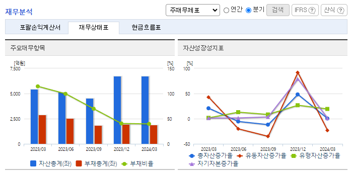 -2024년 3월 전년동기 대비 별도기준 매출액은 35.9% 감소, 영업이익은 18.4% 감소, 당기순이익은 49.9% 증가. 매출 대부분이 수출에서 발생하는 사업구조임. 주력제품인 양극활물질 및 기능성필름의 수출이 감소. 반면 원재료가 하락으로 수익성은 상대적으로 적게 하락한 모습. 복합기 기종 토너개발 및 마케팅에 집중하고 있으며, 고부가가치 제품 개발에 총력을 기울이고 있음.
