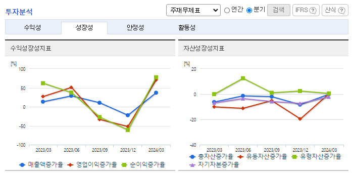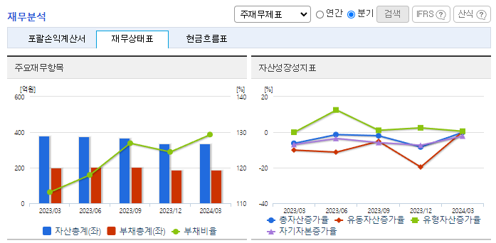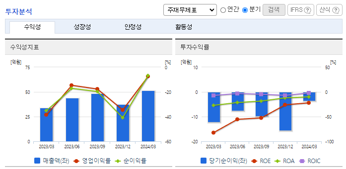 -2024년 3월 전년동기 대비 연결기준 매출액은 51.2% 증가, 영업손실은 71% 감소, 당기순손실은 71.2% 감소. 동사는 매출액증가에 따라 영업손실액이 전년대비 감소 하였으나 적자지속에 따라 자기 자본은 감소하였음. 지속적으로 부가가치가 높은 QD용 필름 OLED용 확산필름, Mini LED용 소재 제품으로 프리미엄급 제품 시장의 다양화를 통하여 시장 확대를 할 예정임.