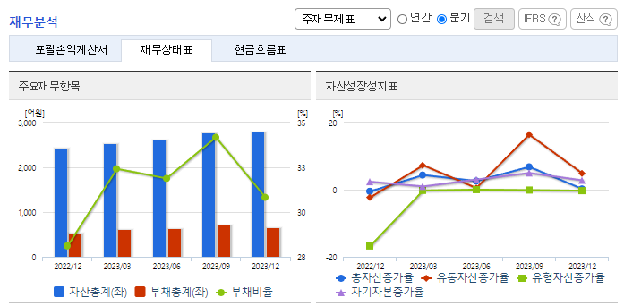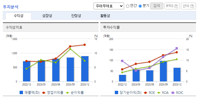 -2023년 9월 전년동기 대비 연결기준 매출액은 20.4% 증가, 영업이익은 75.2% 증가, 당기순이익은 204.2% 증가. 매출부문 중에서 스킨케어 베이직 매출부문이 60.60%, 베이스 메이크업 매출부문이 16.68% 증가하며 전체적인 외형 성장을 이끎. 영업 외 손익에서 이자비용 등이 포함된 금융비용이 69.55% 감소하며 당기순이익에 긍정적인 영향을 줌.
