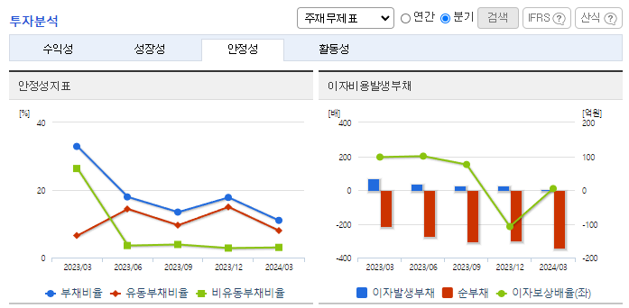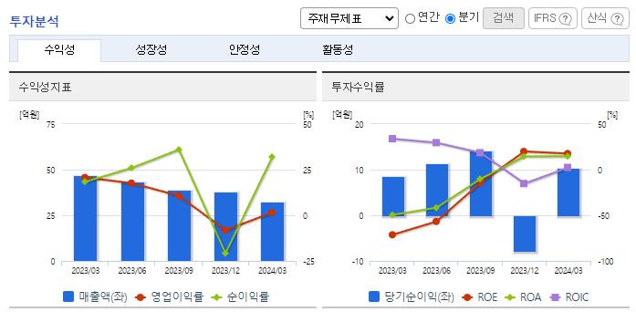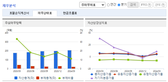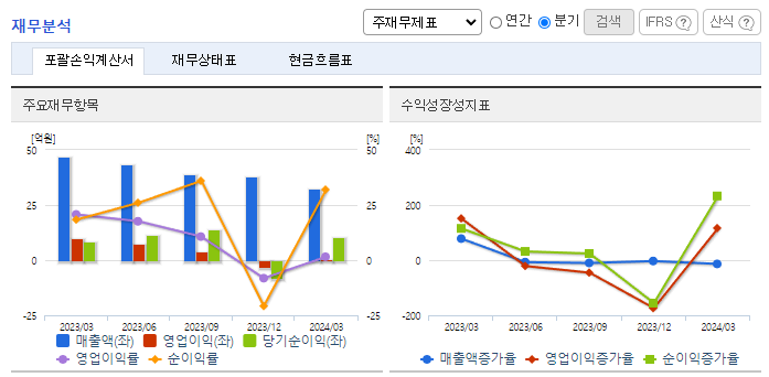 -2024년 3월 전년동기 대비 연결기준 매출액은 30.4% 감소, 영업이익은 94.8% 감소, 당기순이익은 21.3% 증가. 동영상 편집앱, 키네마스터의 경우 크게 구독, 광고 매출로 이루어져 있으며, 전체매출의 대부분이 구독매출에서 발생되고 있음. 구독 매출의 경우 기존 월간 $11.99, 연간 $119.99에서 2023년 3월 14일부터 월간 $9.99, 연간 $49.99으로 변경되어 매출액이 대폭 감소함.