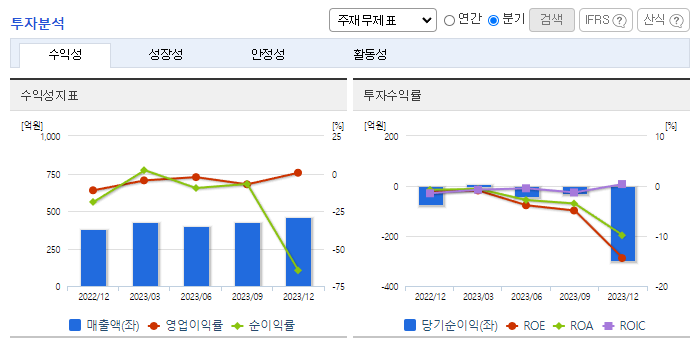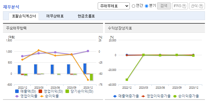 -2023년 12월 전년동기 대비 연결기준 매출액은 0.9% 증가, 영업이익 적자전환, 당기순손실은 1123.3% 증가. 동사의 국내외 플랫폼이 견조하게 성장하였으며, 콘텐츠 유통의 확대, 온오프라인 굿즈 매출 호조로 연결 기준 매출액이 소폭 증가함. 사업 영역 확대와 신규 시장 개척을 위한 해외 플랫폼에 대한 투자, 내부 콘텐츠 제작 역량 제고를 위한 스튜디오 설립 등 비용이 증가하면서 영업이익은 적자로 전환함.