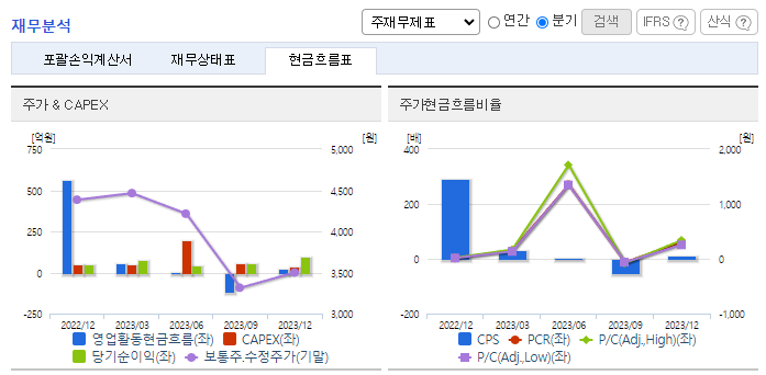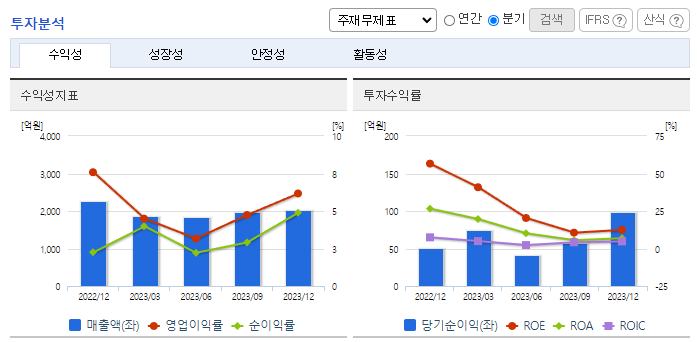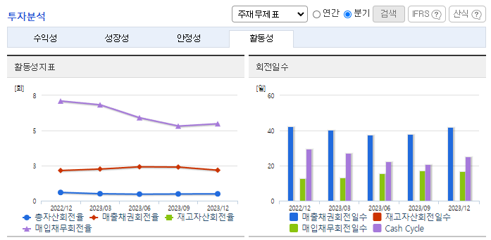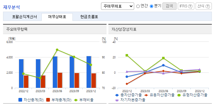 -2023년 12월 전년동기 대비 연결기준 매출액은 42% 감소, 영업이익은 69.1% 감소, 당기순이익은 71.2% 감소. 물류시장은 치열한 레드오션시장이나 당사는 안정적인 거래처 확보를 통한 영업활동을 하고 있음. 재무비율 측면에서는 자기 자본비율이 전년 대비 1.7% p 감소한 54.1%, 부채비율이 전년 대비 5.8% p 감소한 85.0%로 견실한 재무구조를 지속적으로 유지함.