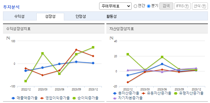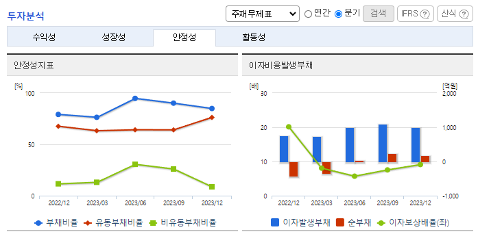 -2023년 12월 전년동기 대비 연결기준 매출액은 42% 감소, 영업이익은 69.1% 감소, 당기순이익은 71.2% 감소. 물류시장은 치열한 레드오션시장이나 당사는 안정적인 거래처 확보를 통한 영업활동을 하고 있음. 재무비율 측면에서는 자기 자본비율이 전년 대비 1.7% p 감소한 54.1%, 부채비율이 전년 대비 5.8% p 감소한 85.0%로 견실한 재무구조를 지속적으로 유지함.
