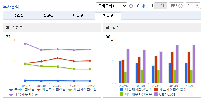 -2023년 12월 전년동기 대비 연결기준 매출액은 20% 감소, 영업이익은 74% 감소, 당기순이익은 57.2% 감소. 사업부문별로 전자재료 사업 매출이 28% 감소한 825억 원, 소비재 사업 매출이 6.4% 감소한 633억 원의 매출을 기록하였음. 동사는 2차 전지 사업성장에 따라 새만금 국가산업단지에 신규 공장을 준비하였으며, 2024년 상반기 초도 매출을 시작으로 전자재료사업부 매출 증대를 기대하고 있음.