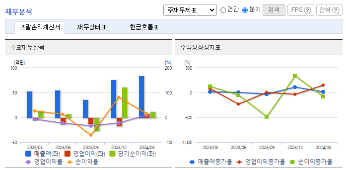 -2024년 3월 전년동기 대비 별도기준 매출액은 57.9% 증가, 영업이익 흑자전환, 당기순이익은 13% 감소. 화웨이총판 사업부의 매출이 발생하지 않았으나, SIP 사업에서의 매출 성장으로 매출액이 큰 폭으로 증가하였고, 판매비 관리비 감소에 따라 이익률도 상승함. 반도체 후공정 제조 기술을 넘어서 마케팅 및 시스템응용을 하는 토탈 솔루션 사업을 목표로 하고 있음.