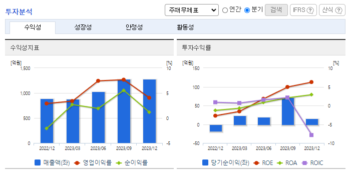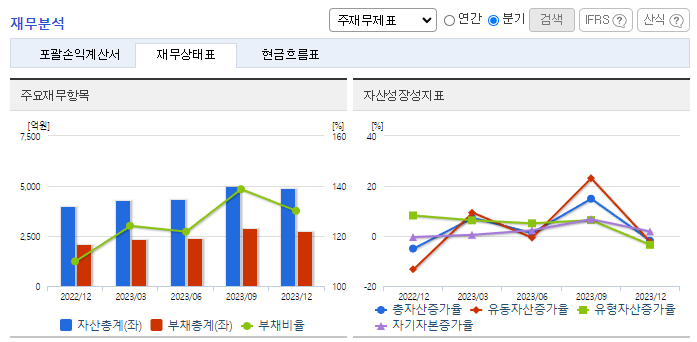 -2023년 12월 전년동기 대비 연결기준 매출액은 36.3% 증가, 영업이익은 264.4% 증가, 당기순이익 흑자전환. 자산총계는 4889억 원을 기록했음. 전년 대비 894억 원 늘어난 수치임. 투자를 위한 유형자산 증설과 시설자금 차입 등의 영향임. 2021년 자동차 디스플레이 양산을 시작했음. 2023년에는 국내 생산 거점을 확보해 고객 대응 능력을 개선해나가고 있음.