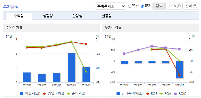 -2023년 9월 전년동기 대비 연결기준 매출액은 45.7% 증가, 영업손실은 14.1% 감소, 당기순손실은 20% 감소. 라이선스 수익 외, 매출은 감소하였지만, 라이센스 수익이 전년동기 대비 113.65% 증가하며 매출성장을 이끎. 동사의 매출액이 큰 폭으로 상승했음에도, 매출원가와 판관비가 각각 -22.4%, -11.7%를 기록하며 영업손실에 긍정적인 영향을 줌.