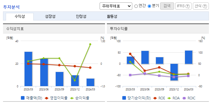 -2024년 3월 전년동기 대비 별도기준 매출액은 77.6% 감소, 영업손실은 358.3% 증가, 당기순이익은 87.6% 증가. 동사는 건설경기 불황으로 인한 PHC 파일 실적저조 및 원재료 및 인건비 상승에 기인하여 영업손실을 기록하였음. 과감한 영업전략 수립 및 가격 경쟁력 확보, 재고자산의 효율적 관리와 원가절감 및 거래처 신용상태의 지속적인 파악 및 분석을 통하여 부실의 최소화에 역점을 두고 있음.
