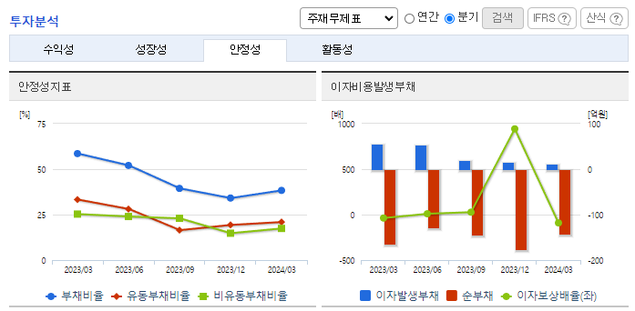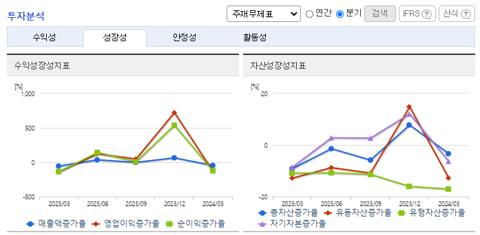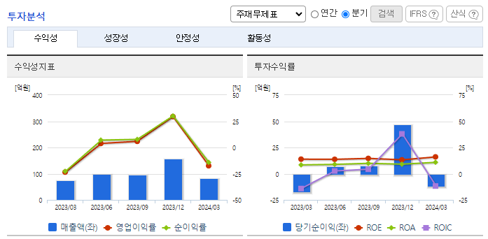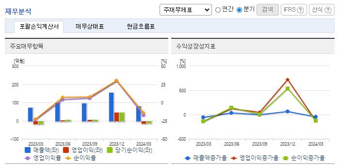 -2024년 3월 전년동기 대비 연결기준 매출액은 9.6% 증가, 영업손실은 18.7% 감소, 당기순손실은 32.3% 감소. 매출원가가 7.1% 감소하면서 영업이익에 긍정적인 영향을 줌. 주요 매출처는 롯데정보통신, 동행복권, 한국인터넷진흥원, 포스코디엑스, 엘에스일렉트릭, 주식회사 시큐온 등이며 상기 주요 거래처들의 매출 비중은 전체 매출액의 약 27%를 차지.