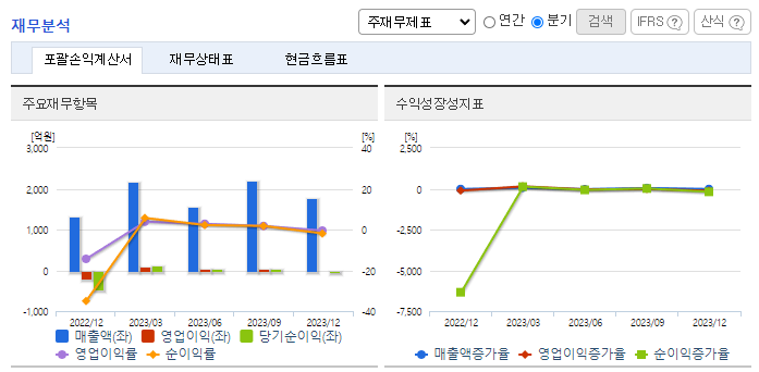 -2023년 12월 전년동기 대비 연결기준 매출액은 3.9% 증가, 영업이익 흑자전환, 당기순이익 흑자전환. 스마트폰 시장의 수요 위축에도 불구, 동사 ES(Energy Solution) 사업부문은 2차전지 시장의 성장세 지속으로 사업부문 외부매출의 증가와 함께 영업이익도 크게 개선됨. 작년 하반기 2차 전지 관련 국내 주요 Cell 업체와의 전략적 제휴를 통한 매출이 본격화됨.