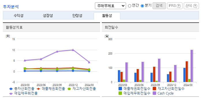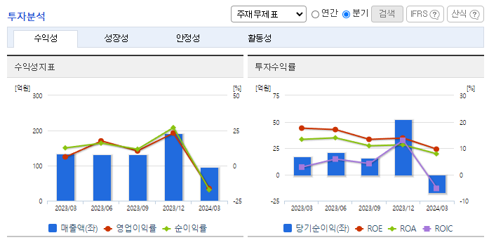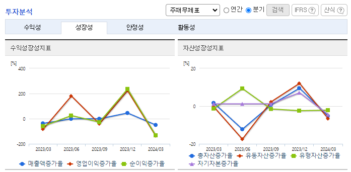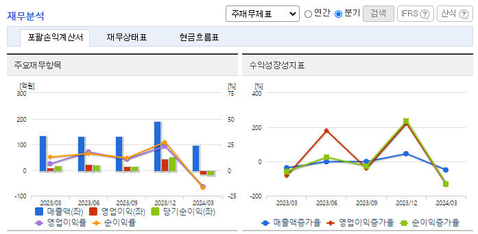 -2024년 3월 전년동기 대비 별도기준 매출액은 27.6% 감소, 영업이익 적자전환, 당기순이익 적자전환. 보안서비스 및 유지보수 사업 부문은 10.36% 증가했지만, 네트워크 장비 사업 부문이 43.67% 감소하면서 외형 성장에 악영향을 줌. 프로젝트성 매출을 제외한다면 기존 사업들은 지속적인 성장을 하고 있으며, 클라우드 인프라 최적화를 위한 시장 수요를 발굴할 예정임.