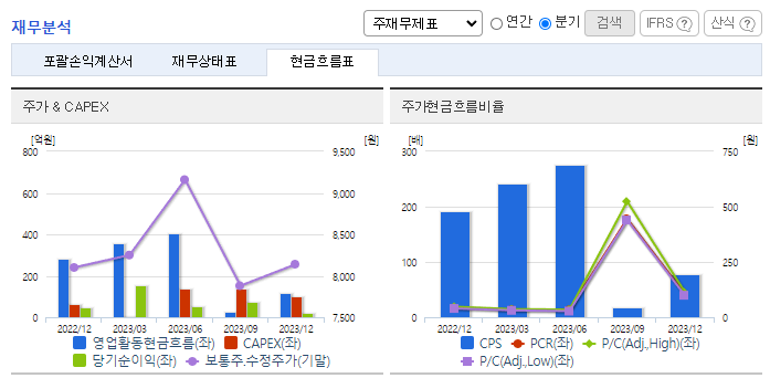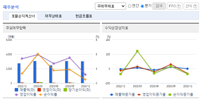 -2023년 9월 전년동기 대비 연결기준 매출액은 8.3% 감소, 영업이익은 17.5% 감소, 당기순이익은 24.9% 감소. 전반적인 사업부 전체의 매출이 10%가량 감소하였으며, 광메카 산업의 전체 매출 비중이 감소하였음. 이에 영업이익이 약 15%가량 감소함 2023년에는 포스터치 센서, 차량용 타이어 TMS 센서, 성인 및 유아용 스마트 기저귀 센서가 사업화될 것으로 예상되어 매출 규모는 더욱 확대될 것으로 예상됨.