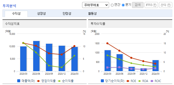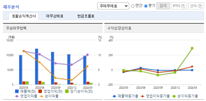 -2024년 3월 전년동기 대비 연결기준 매출액은 2.1% 감소, 영업이익은 12.8% 감소, 당기순이익은 46.6% 감소. 건화물선 운임지수의 하락 및 원/달러 환율 하락 등의 외부적인 요인과 컨테이너선과 탱커선 부문의 수익성 악화, 컨테이너선의 운임 급락 등으로 영업손실을 기록함. 환경규제 강화로 인해 운임 상승을 통해 수익성이 개선될 것으로 기대되며, 중국 철강 수요 회복과 노후선 폐선으로 올해보다 좋아질 것으로 기대됨.