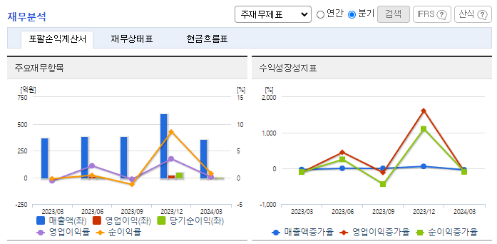 -2023년 12월 전년동기 대비 별도기준 매출액은 8.1% 증가, 영업이익은 19.4% 감소, 당기순이익은 157.5% 증가. 주력인 무기, 총포탄 제조업에서 전년 대비 매출이 늘어나며 전체 외형 성장. 매출 증가와 원가율 하락에도 불구하고 판관비와 인건비 등 비용이 크게 늘며 영업이익 감소 방산은 정부 정책과 시장 수요에 따라 움직이는 산업. 추가 해외진출 및 전략시장 진출을 모색하며 시장 점유율을 확대해나갈 예정.