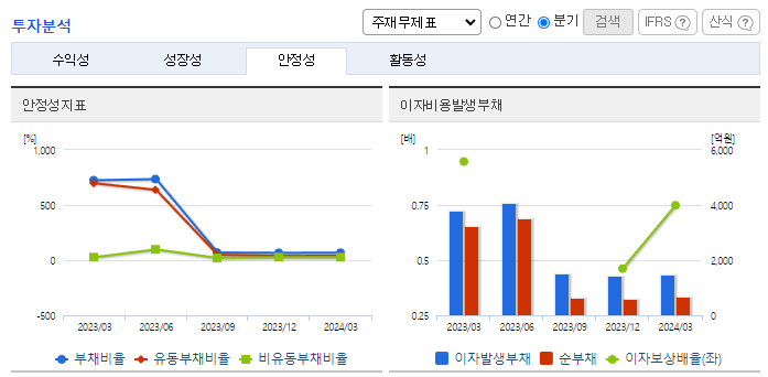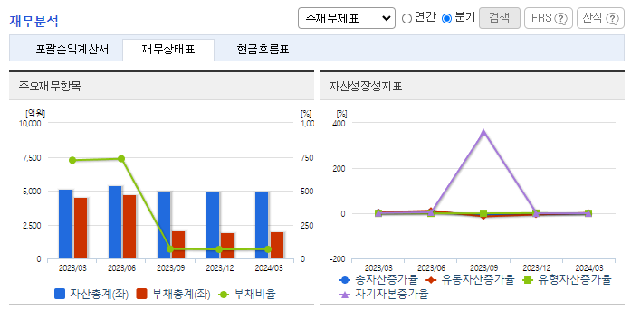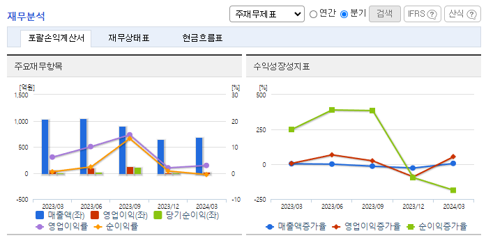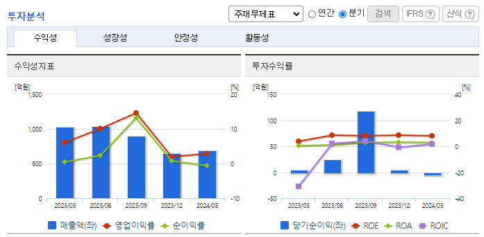 -2024년 3월 전년동기 대비 연결기준 매출액은 32.8% 감소, 영업이익은 68.3% 감소, 당기순이익 적자전환. 부동산분양 관련 매출이 발생하지 않았고, 제지 관련 매출이 7.1% 감소하는 등 매출이 감소함에 따라 수익성 악화됨. 원재료 가격 안정세로 원가구조가 개선되었고, 친환경 소재의 수요가 증가하면서 판가와 수익성을 고려한 판매전략으로 영업이익률 제고를 기대 중.
