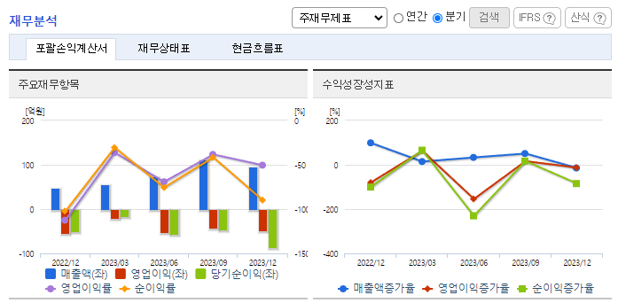 -2023년 12월 전년동기 대비 연결기준 매출액은 108.4% 증가, 영업손실은 54.9% 증가, 당기순손실은 121.4% 증가. KEYCUT STOCK은 보다 넓은 크리에이터 커뮤니티를 통합적으로 지원할 수 있도록 플랫폼 내 이미지 등 카테고리 확장을 진행하였음. 기존 영상 거래처인 글로벌 가전사 및 디스플레이사, 광고대행사, 지방자치단체 등과 더불어 신규 사업 콘텐츠의 거래처 홈쇼핑, 엔터테인먼트 등 다변화 추진 중임.
