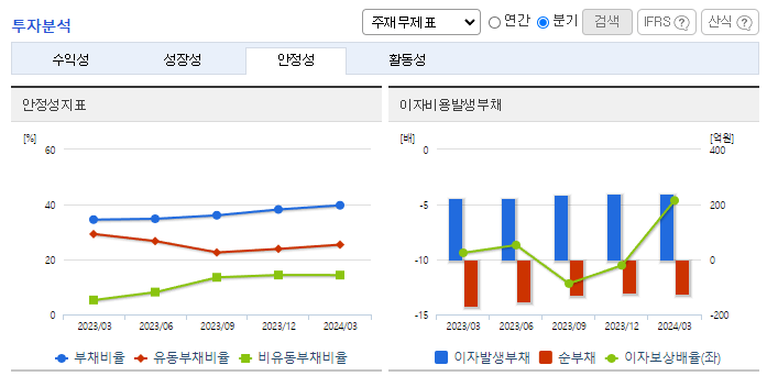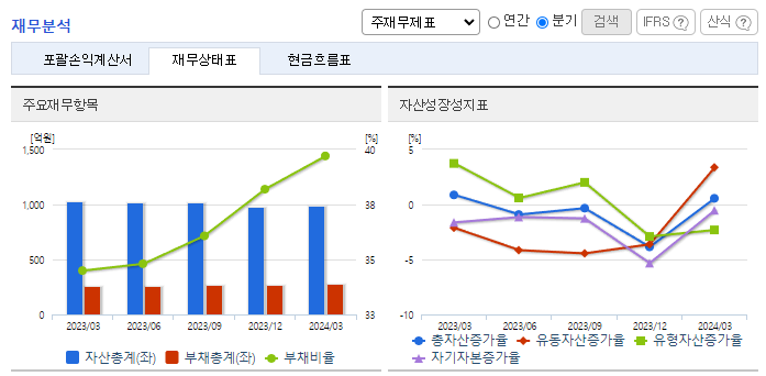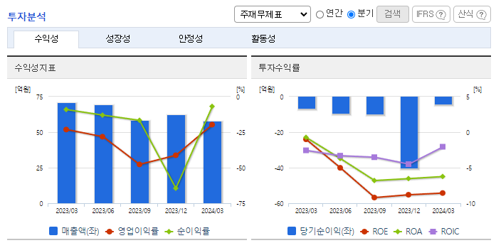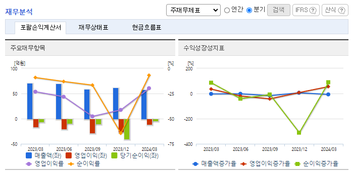 -2024년 3월 전년동기 대비 연결기준 매출액은 18.1% 감소, 영업손실은 30.5% 감소, 당기순손실은 38.3% 감소. 매출원가와 판관비가 22.0%, 15.7% 감소하면서 매출액 감소에도 불구하고 영업손실이 감소함. 매출구조가 디스플레이 업황과 특정 고객사에 종속됨을 탈피하고자 Pin Foundry 사업부를 출범하고 새로운 매출 파이프라인을 장착하기 위해 노력하고 있음.