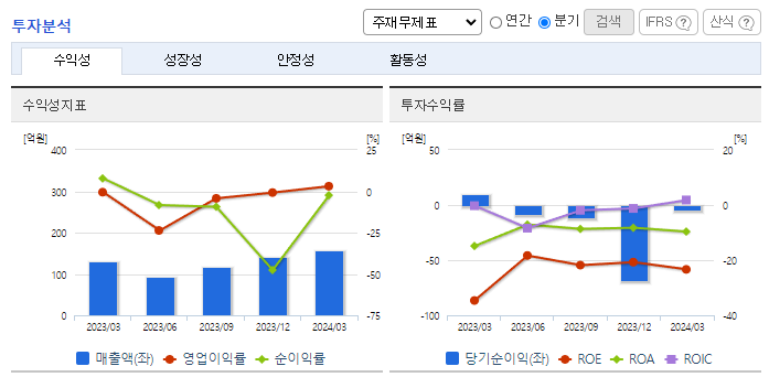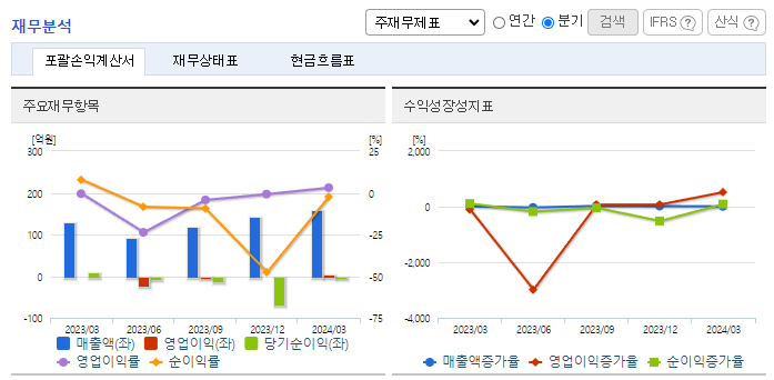 -2024년 3월 전년동기 대비 연결기준 매출액은 21.3% 증가, 영업이익 흑자전환, 당기순이익 적자전환. 광학필터 사업부문이 11.42%, Hall Sensor IC 외 사업부문이 39.04% 증가하면서 외형 성장을 이끎. 보안 카메라 업체 및 지문인식기 업체에서 요구하고 있는 현재 범용 Spec 외 여러 가지 신규 사양으로 지속적인 개발 활동에 참여하고 있음.