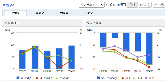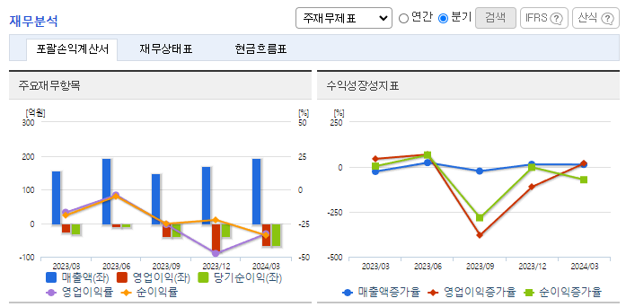 -2024년 3월 전년동기 대비 연결기준 매출액은 25.2% 증가, 영업손실은 143.1% 증가, 당기순손실은 139.8% 증가. 실적부진의 주된 원인은 신제품 론칭 및 R&D 투자 확대와 홈쇼핑 판매수수료 등 마케팅 비용 증가로 보임. 동사는 천연물 기반 탈모 개선 건강기능식품과 화장품, 줄기세포 기반 탈모 치료제까지 탈모를 해결할 수 있는 전주기 제품군 개발을 통해 독보적인 경쟁력을 갖춰나가고 있음.