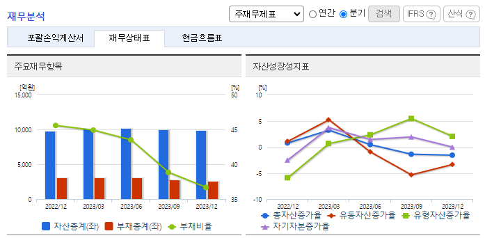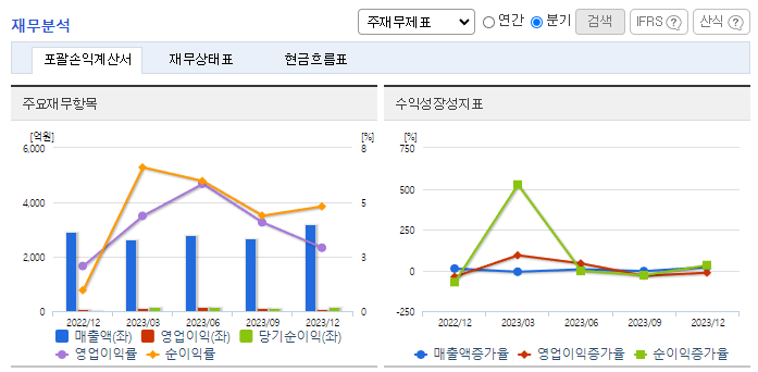 -2023년 12월 전년동기 대비 연결기준 매출액은 10.8% 증가, 영업이익은 111.1% 증가, 당기순이익은 117.6% 증가. 동사는 완성차업체(현대, 기아) 판매 물량 증가, 환율(USD) 상승, 신차종 금형매출 증가로 실적이 개선됨. 또한, 전전 대비 당해 사업연도 해상운임 정상화에 따른 수출제비 인하, 수입배당금에 대한 세법개정안 반영에 따른 법인세 인하효과로 수익성이 증가함.