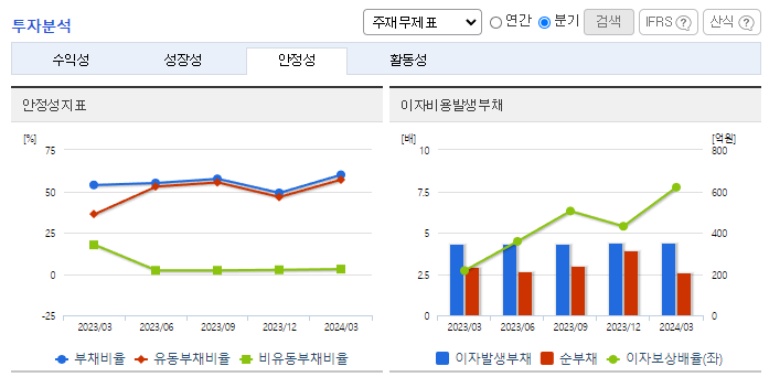 -2024년 3월 전년동기 대비 별도기준 매출액은 6% 감소, 영업이익은 214.8% 증가, 당기순이익은 173.8% 증가. 매출이 전년 대비 감소하였지만 판매비와 관리비는 효율적으로 집행되었고 원가율 또한 감소하여 영업이익에 긍정적으로 작용하였음. 동사의 2024년 1분기까지 생산실적은 33,245백만 원으로 2023년 35,385백만 원 보다 6 % 감소하였음.
