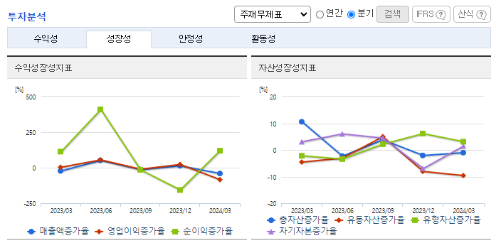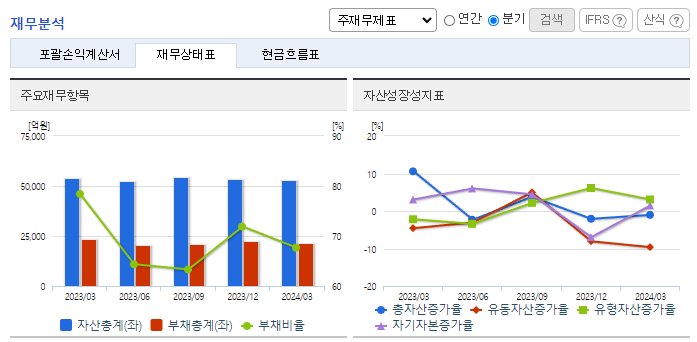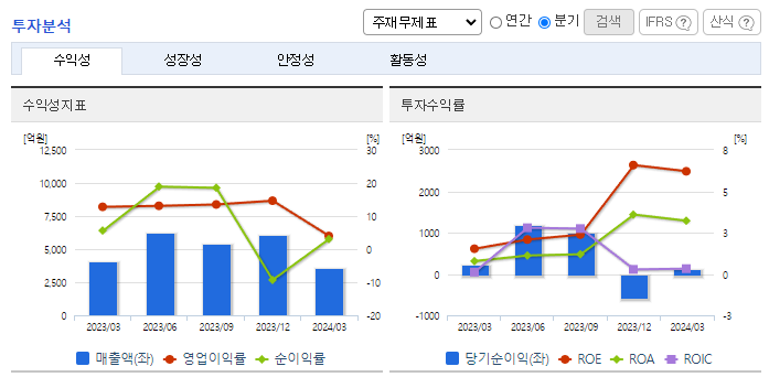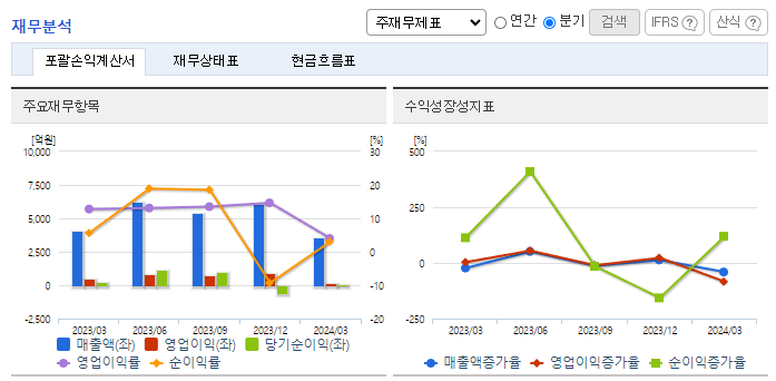 -2024년 3월 전년동기 대비 연결기준 매출액은 12.1% 감소, 영업이익은 72.6% 감소, 당기순이익은 29.1% 감소. 주요 아티스트의 활동 공백과 신인 아티스트의 데뷔로 비용이 반영되어 영업이익이 감소함. 신규 아티스트를 발굴, 육성하여 라인업을 공고히 하고, 앨범, 공연 등 아티스트 직접참여형 매출은 물론 MD 및 라이선싱, 콘텐츠 등 간접참여형 매출도 주력할 예정.