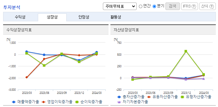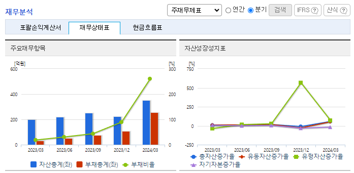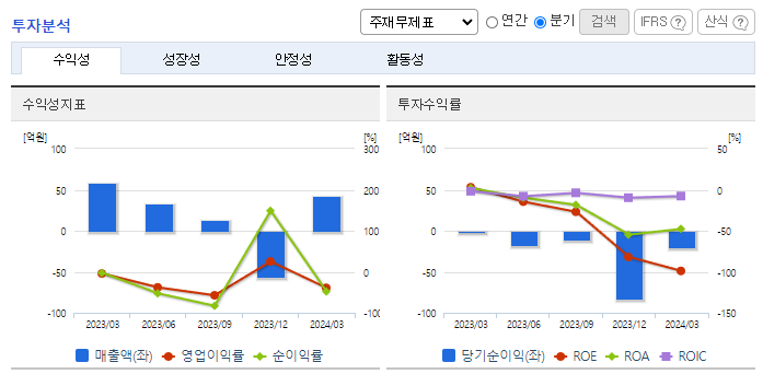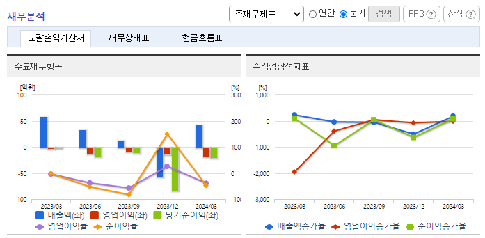 -2024년 3월 전년동기 대비 연결기준 매출액은 88.1% 증가, 영업손실은 1868.2% 증가, 당기순손실은 1136.7% 증가. 동사는 전년동기 대비 인건비 및 지급수수료, 임차료 등과 같은 판관비가 대거 증가하면서 영업손실폭이 증가함. 2023년 12월 글로벌 이차전지기업인 AESC社의 업체 등록을 하였고, 2024년 샘플 공급을 시작으로 제품화하여 매출을 확대 계획 중.
