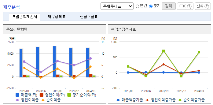 -2024년 3월 전년동기 대비 연결기준 매출액은 2.9% 증가, 영업이익은 25% 증가, 당기순이익은 19.4% 증가. 2023년 11월 맥주, 소주 가격 상승으로 인한 매출원가율 개선 및 판관비의 광고선전비가 20% 감소함에 따라 수익 증가함. 2026년에 완공 예정인 베트남 현지 공장 설립 계획에 따른 재고 조정과 해외 제품 리뉴얼 등이 매출에 영향을 줄 것으로 예상.