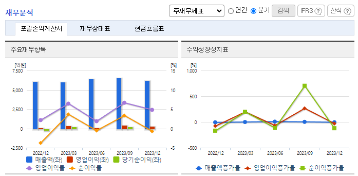 -2023년 9월 전년동기 대비 연결기준 매출액은 0.6% 증가, 영업이익은 47% 감소, 당기순이익은 63.4% 감소. 매출은 소폭 성장했으나 광고선전비가 40.7%, 용역비가 30% 증가함에 따라 영업이익 크게 감소함. 프리미엄 소주 시장 및 과실주 시장에서 트렌드를 선도하기 위해 노력 중이며 2023년 9월 출시한 '일품진로 23년 산' 한정판은 시장 품귀 현상이 발생함.