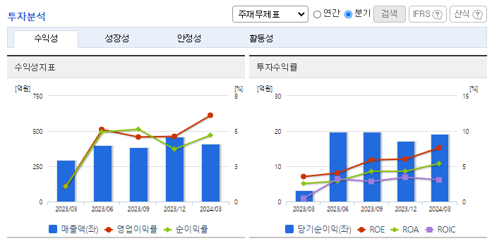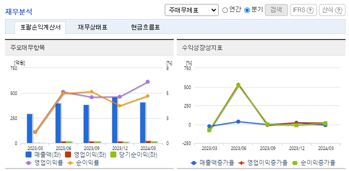 -2024년 3월 전년동기 대비 별도기준 매출액은 37.8% 증가, 영업이익은 670.8% 증가, 당기순이익은 500.9% 증가. 신규사업인 욕실 인테리어 시장의 성장과 더불어 현재 인건비 및 자재/상품매입을 위한 지출을 제외한 큰 투자비용이 없어 영업이익 증가에 영향을 줌. 위생도기, 기능성 수전, 욕실 액세서리, 일체형 비데 등 다양한 제품을 합리적인 가격으로 제공하여 차별화된 중고가 시장으로 확대할 예정임.