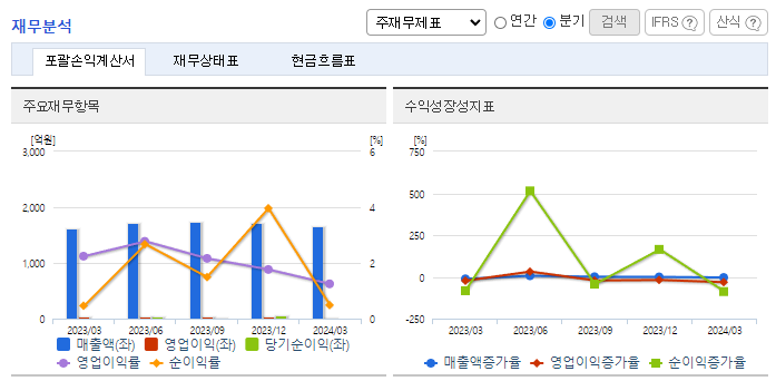 -2024년 3월 전년동기 대비 연결기준 매출액은 2.6% 증가, 영업이익은 42.9% 감소, 당기순이익은 5.4% 증가. 핵심 사업부문인 아스팔트상품부문에서 실적 회복되며 외형 소폭 확대된 모습이나, VB-1 등 원재료가 상승 여파로 수익성은 비교적 큰 폭으로 하락한 모습. 향후 정부정책에 맞춰 친환경 신제품을 지속적으로 개발하고, 신규시장 개척에 역량을 집중하여 실적 개선 도모 중.