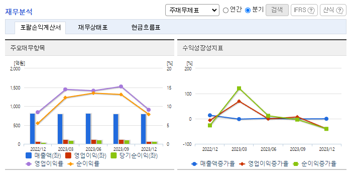-2023년 12월 전년동기 대비 별도기준 매출액은 6.2% 증가, 영업이익은 20.6% 증가, 당기순이익은 39.9% 증가. 전체 매출액 구성비는 상품매출이 14%, 제품매출 86%, 기타 매출이 0.3%이며 상품 및 제품은 윤활유, 그리스 제품임. 매출액은 국내 수요 증가로 전년 대비 윤활유, 그리스 제품의 매출액이 각각 6%, 1% 증가했으며, 윤활유 및 그리스의 상품 매출액이 9% 증가하였음.
