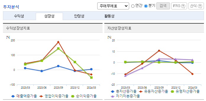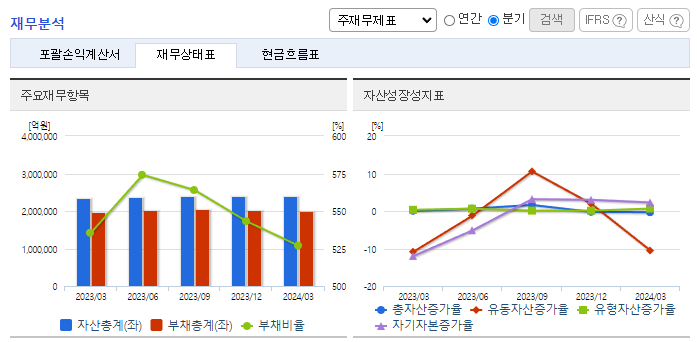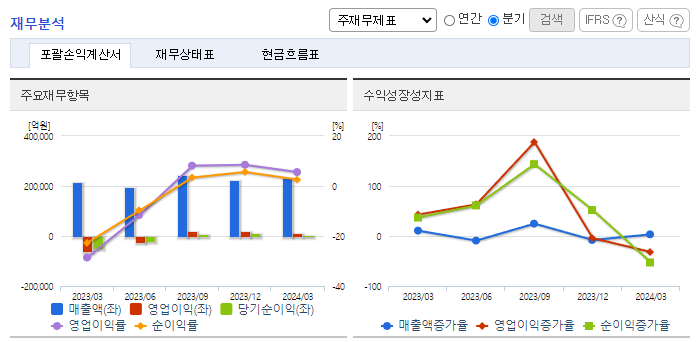 -2024년 3월 전년동기 대비 연결기준 매출액은 7.9% 증가, 영업이익 흑자전환, 당기순이익 흑자전환. 동사의 전체 매출액 중 약 98%를 차지하는 전기판매 사업부문의 매출이 전년동기 대비 증가하고 원재료 가격이 감소하면서 영업이익이 흑자전환됨. 미래에너지 시장을 선도하기 위해 2024년 1분기 약 462억 원을 투입하여 총 195건의 연구개발 과제를 수행하고 있음.