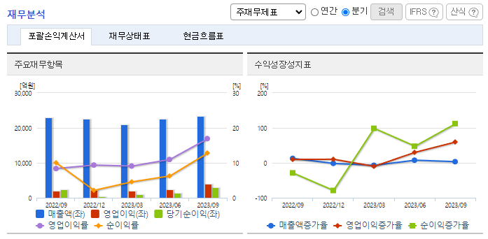 -2023년 9월 전년동기 대비 연결기준 매출액은 9.4% 증가, 영업이익은 69.2% 증가, 당기순이익은 19.2% 감소. 동사는 자동차 산업 수요 회복 등으로 인해 전년 동기 대비 매출액이 증가했고, 원재료 가격이 안정돼 영업이익 또한 증가함. 동사는 현재 추진 중인 신규 사업은 없으나, 공격적인 기술 개발 및 투자, 브랜드 파워 강화, 고객 서비스 만족도 제고 등 기본기에 충실한 경영 활동을 통해 성장세를 유지해갈 계획임.