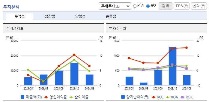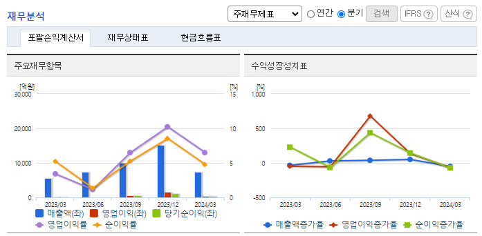 -2024년 3월 전년동기 대비 연결기준 매출액은 30.1% 증가, 영업이익은 147.5% 증가, 당기순이익은 19.6% 증가. 폴란드와 말레이시아 프로젝트의 매출 인식이 확대되면서 하반기로 갈수록 실적이 개선될 것으로 예상됨. 또 국내 사업에서는 KF-21 초도 양산 계약이 예정되어 있음. 록히드마틴과 협력해 추진 중인 미국 해군 고등훈련기 사업도 하반기부터 구체화될 것으로 기대됨.